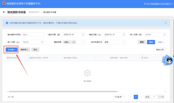 三、海關(guān)繳款書采集,點(diǎn)擊手動錄入。