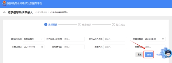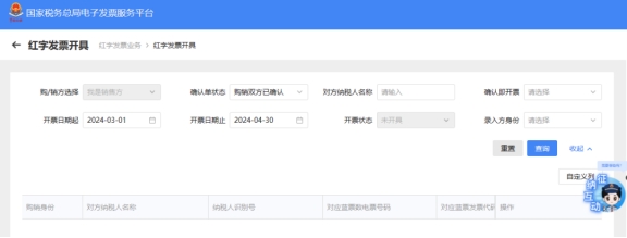 四、錄入查詢條件查詢到此前開(kāi)具的紅字信息確認(rèn)單,點(diǎn)擊右側(cè)的“去開(kāi)票”,進(jìn)入紅字發(fā)票開(kāi)具頁(yè)面,之后正常開(kāi)具紅字發(fā)票即可。