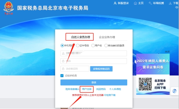 一、點(diǎn)擊北京市電子稅務(wù)局自然人業(yè)務(wù)辦理——點(diǎn)擊用戶注冊(cè),完成個(gè)人賬戶注冊(cè),注冊(cè)成功后登錄自然人業(yè)務(wù)辦理進(jìn)入后按照提示做實(shí)名認(rèn)證。