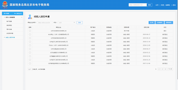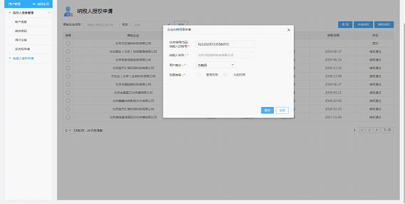 2)? 納稅人點(diǎn)擊“申請(qǐng)授權(quán)”按鈕后,填寫相關(guān)信息,選擇用戶身份,點(diǎn)擊“提交”按鈕。