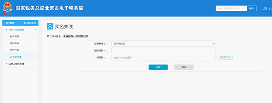 8.? 納稅人點(diǎn)擊“是”,進(jìn)入實(shí)名關(guān)聯(lián)信息界面,選擇相關(guān)信息填寫后,進(jìn)行信息驗(yàn)證后,點(diǎn)擊“關(guān)聯(lián)”按鈕。