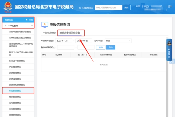 二、我要查詢—一戶式查詢—申報(bào)信息查詢—逾期未申報(bào)信息查詢,調(diào)整查詢條件查看。