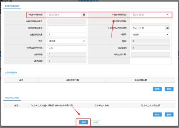 【財(cái)產(chǎn)和行為稅合并申報(bào)】界面點(diǎn)擊【填寫申報(bào)表】,選擇【財(cái)產(chǎn)和行為稅稅源采集】,進(jìn)入“財(cái)產(chǎn)和行為稅納稅申報(bào)稅源采集”模塊后,點(diǎn)擊“印花稅”后方【稅源采集】,進(jìn)入印花稅稅源采集界面,先點(diǎn)擊【按期申報(bào)】,再點(diǎn)擊右上角【新增按期申報(bào)稅源】,在此界面填寫稅源信息,其中稅款所屬期選擇2023年1月1日至2023年12月31日,帶*項(xiàng)為必填項(xiàng),需根據(jù)自身情況填寫相關(guān)數(shù)據(jù),必填信息全部填寫完成點(diǎn)擊【保存】,系統(tǒng)提示保存成功后點(diǎn)擊【確定】即可;