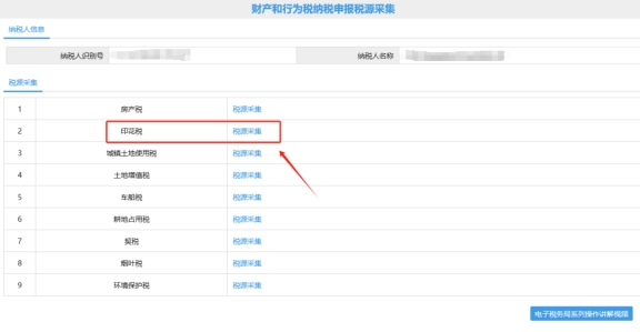 三、進(jìn)入“財(cái)產(chǎn)和行為稅納稅申報(bào)稅源采集”模塊后,點(diǎn)擊“印花稅”后方【稅源采集】。