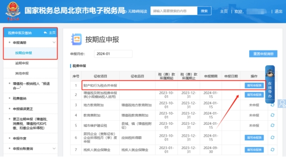 二、稅費(fèi)申報(bào)及繳納—按期應(yīng)申報(bào)—財(cái)產(chǎn)和行為稅合并申報(bào),點(diǎn)擊【填寫申報(bào)表】。