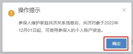 第三步:查看【操作提示】:參保人維護(hù)家庭共濟(jì)關(guān)系信息后,共濟(jì)對(duì)象于2022年12月01日起,可使用參保人的個(gè)人賬戶資金。點(diǎn)擊【確定】按鈕。