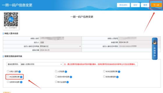 三、 一照一碼戶登記信息變更(或非一照一碼戶信息變更、兩證整合個體工商戶信息變更),勾選【涉證信息變更】查看是否帶出需要變更的項目,如帶出請在“變更后內(nèi)容”中核對帶出內(nèi)容無誤,點擊屏幕右上方【下一步】進行提交,事項辦理完成則稅務(wù)登記變更成功。