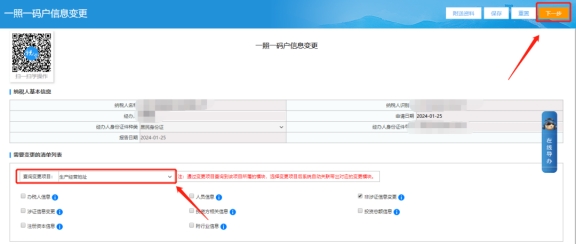 三、一照一碼戶登記信息變更頁(yè)面,在查詢變更項(xiàng)目后點(diǎn)擊下拉菜單,選擇生產(chǎn)經(jīng)營(yíng)地址,將變更后內(nèi)容填寫完畢后點(diǎn)擊下一步提交即可。